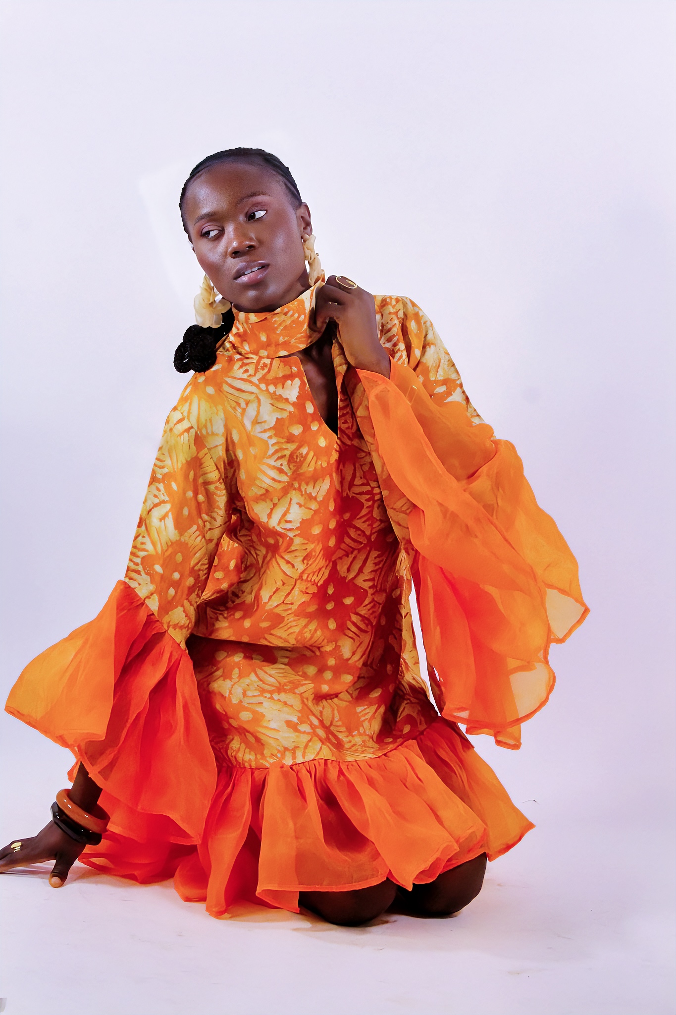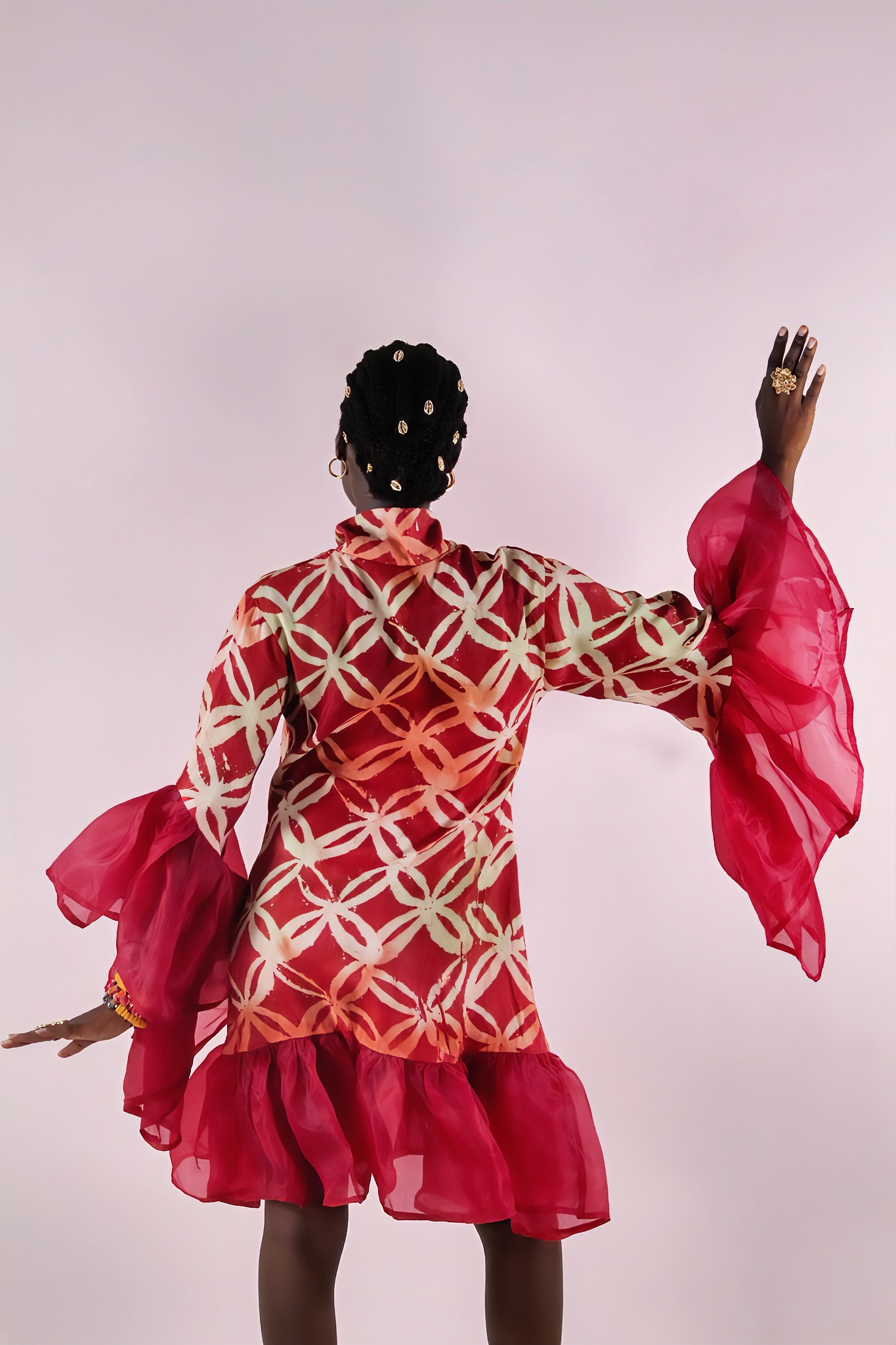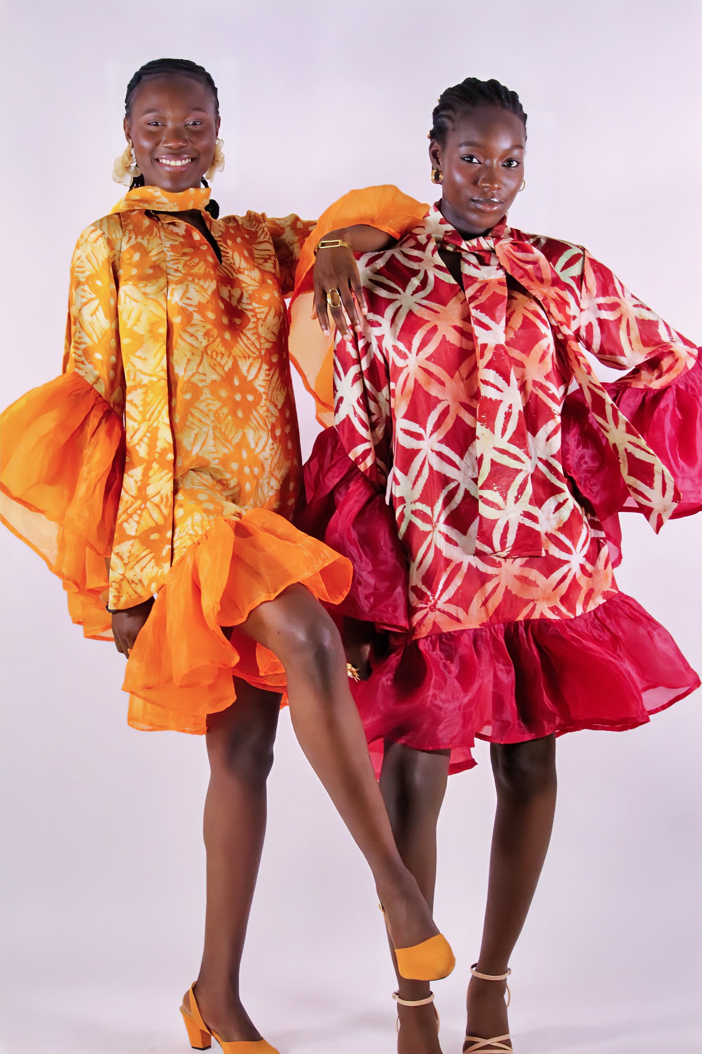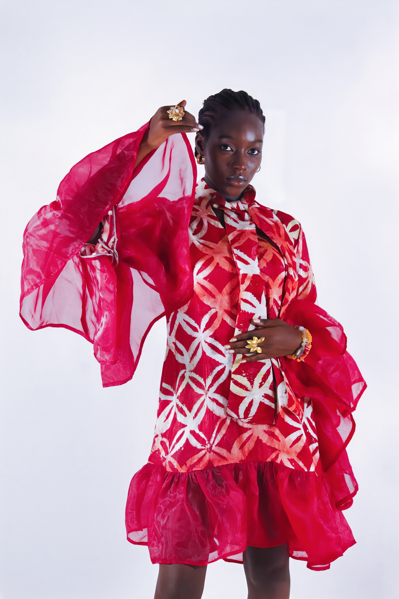 Robe fluide en adiré crêpe, sublimée par des bordures en organza. Sa coupe élégante et légère, aux teintes rouge-orangé vibrantes, en fait une pièce raffinée et pleine de caractère.