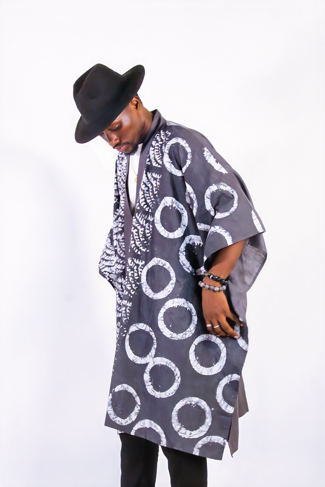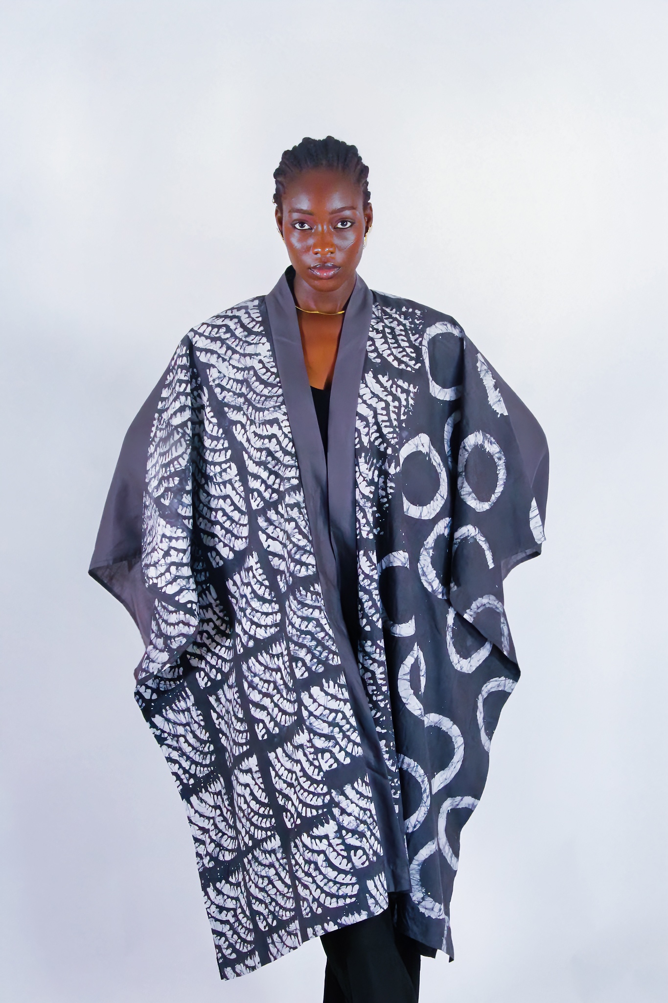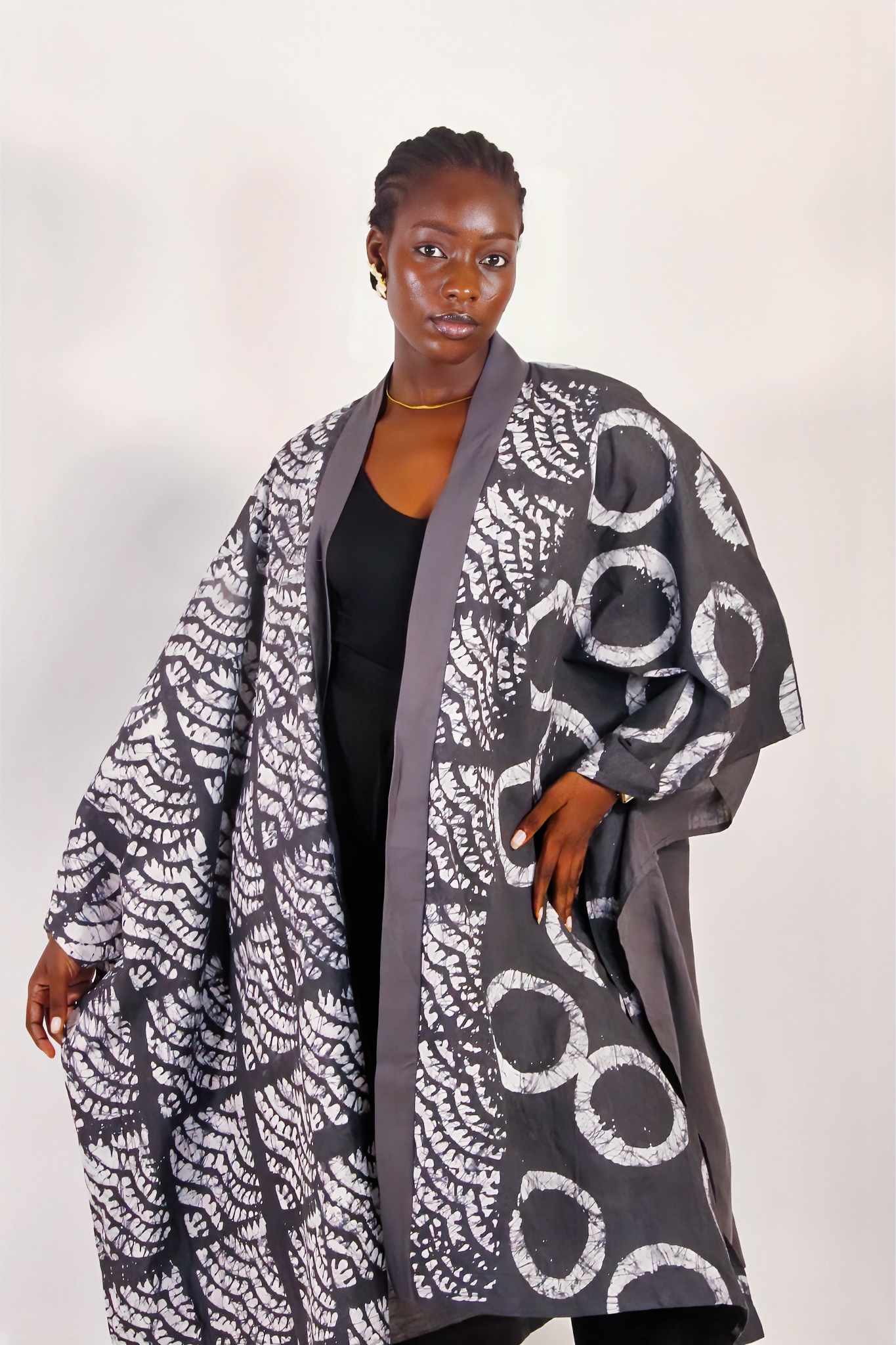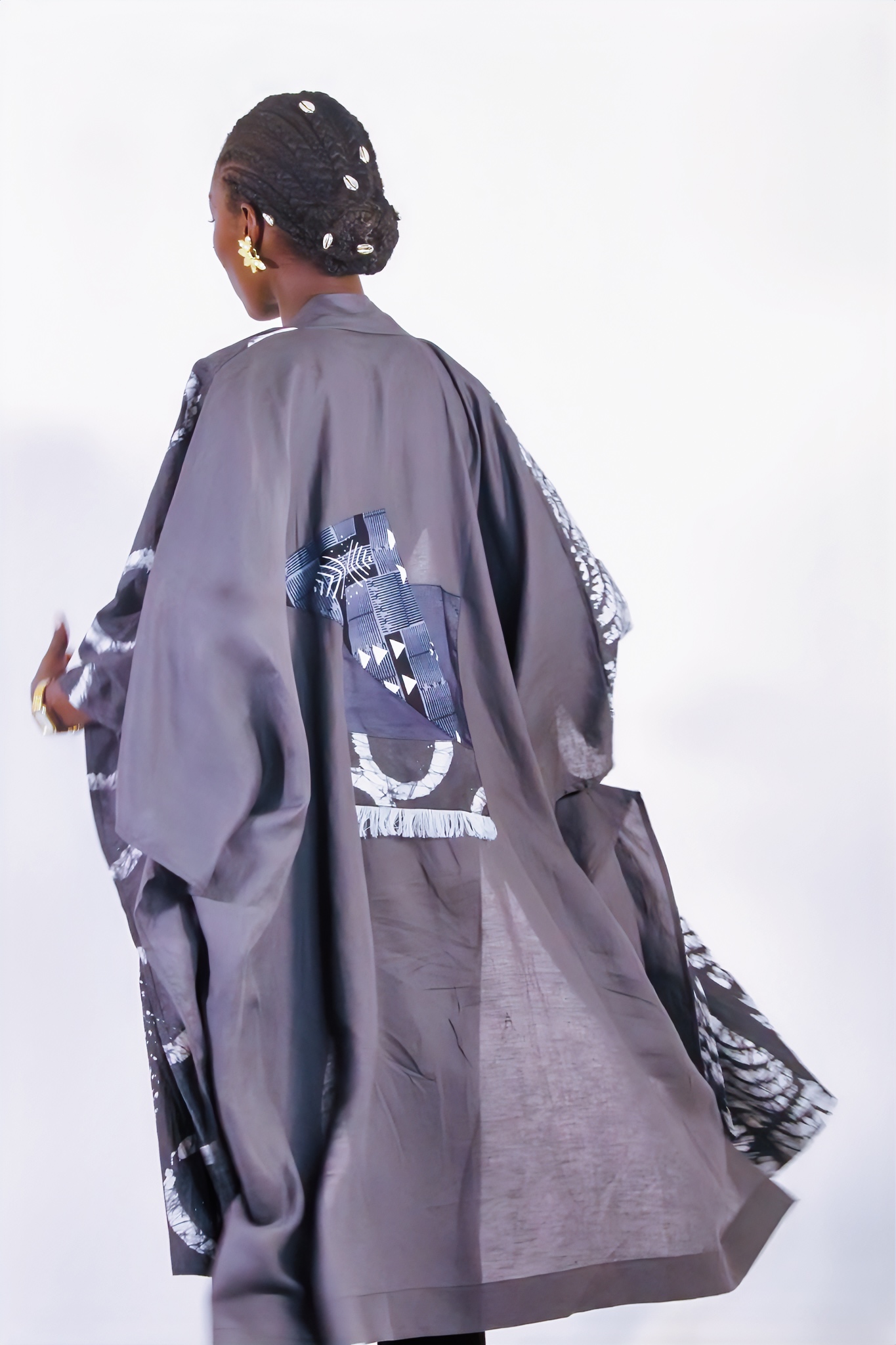 Kimono unisexe au design unique, sublimé par un patchwork de wax, jean et adire à l’arrière. Une pièce moderne et intemporelle qui affirme le style.
