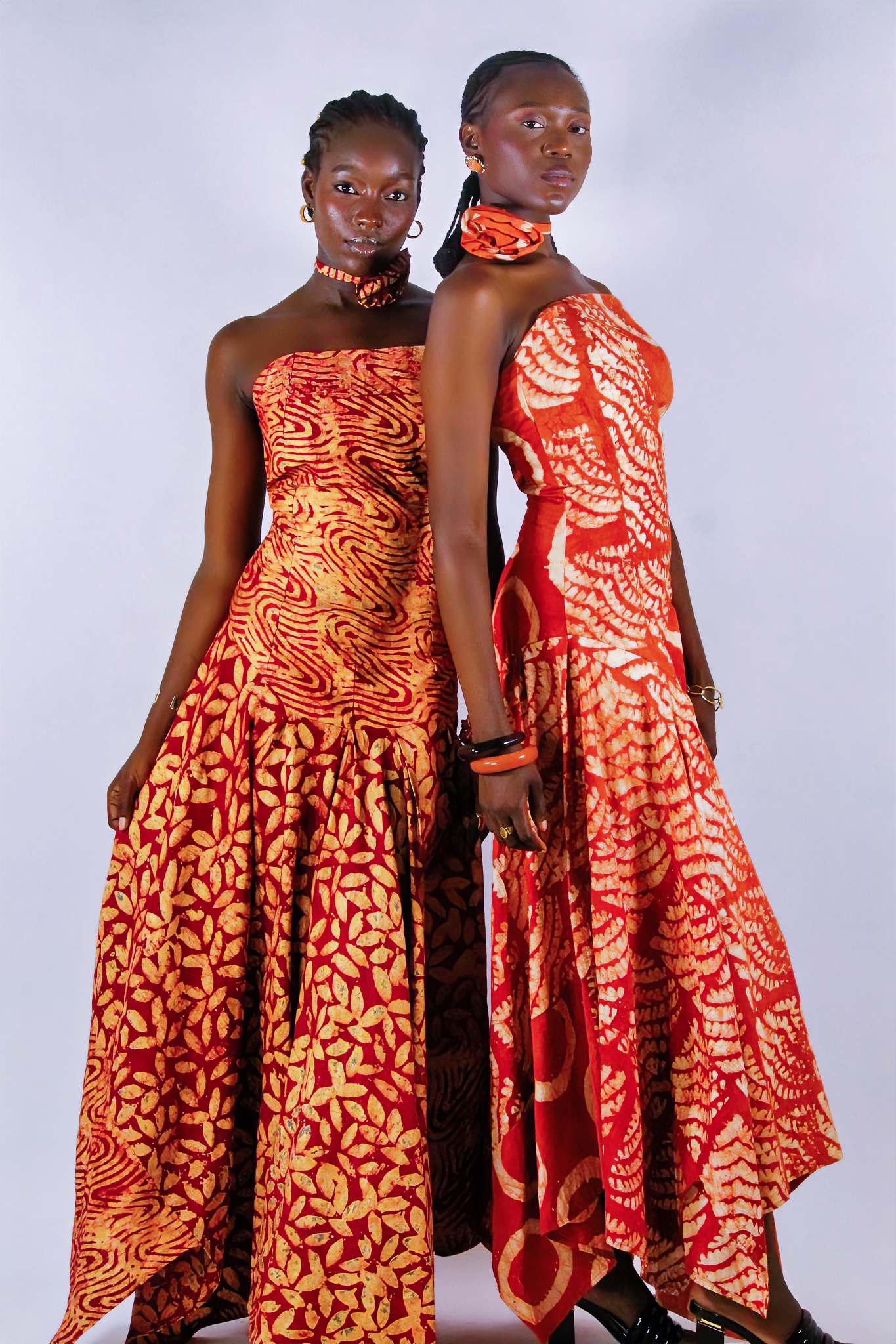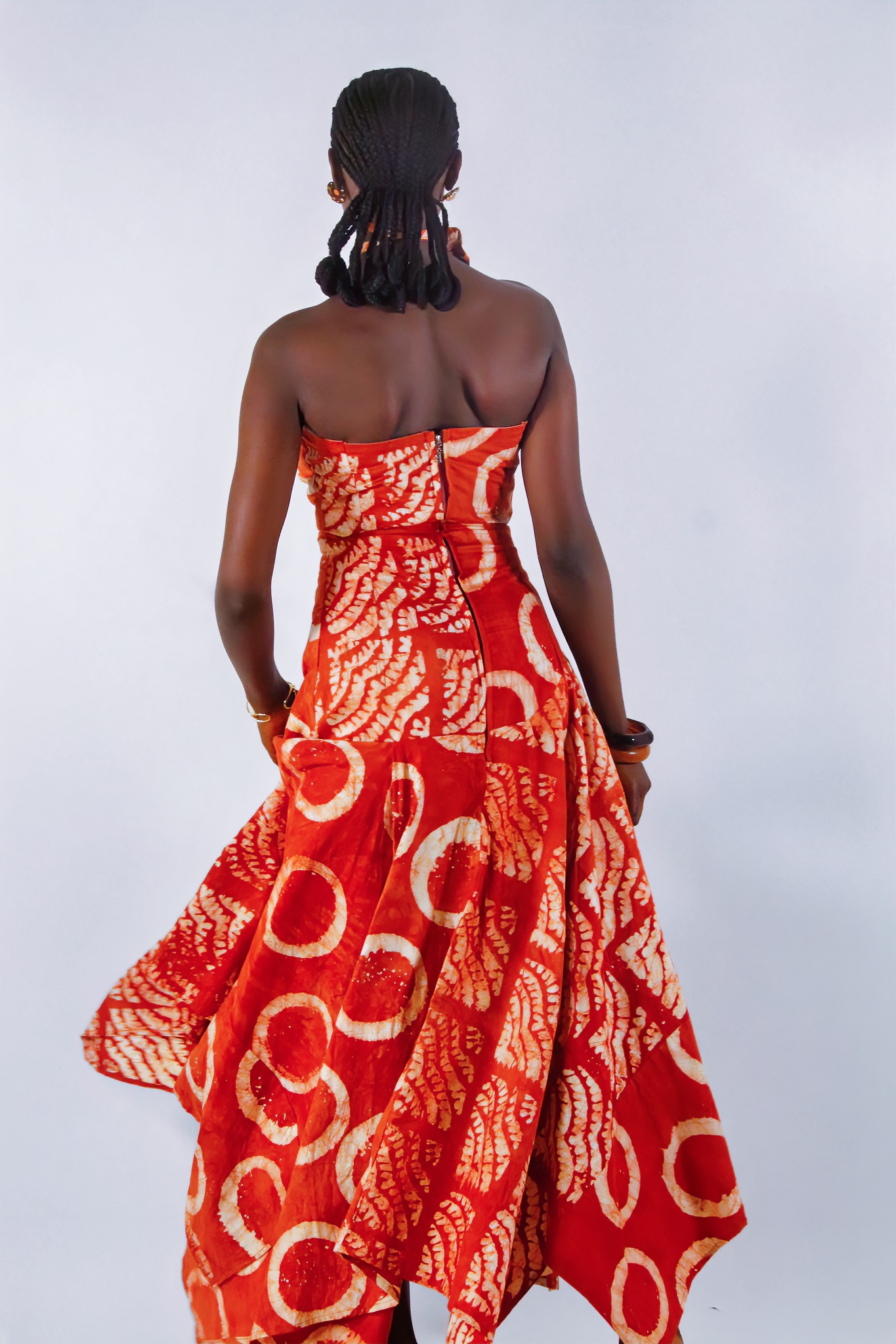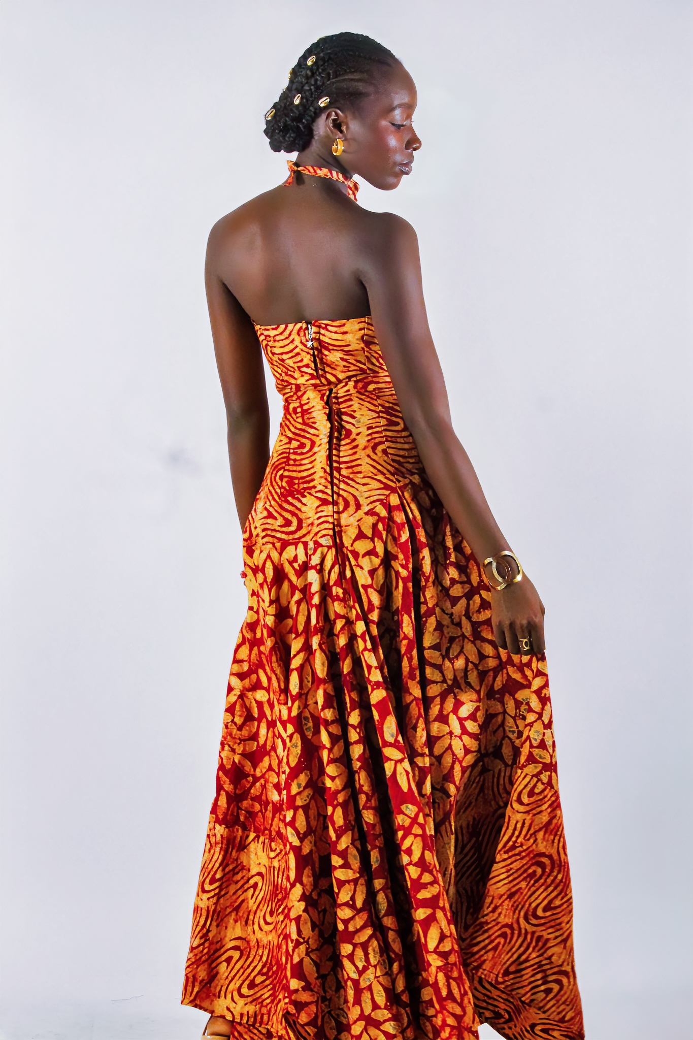 Une robe bustier qui sublime la silhouette : cintrée jusqu’aux hanches, elle s’évase ensuite dans un bas asymétrique fluide. Son collier-fleur ajustable apporte la touche finale, entre élégance et originalité.