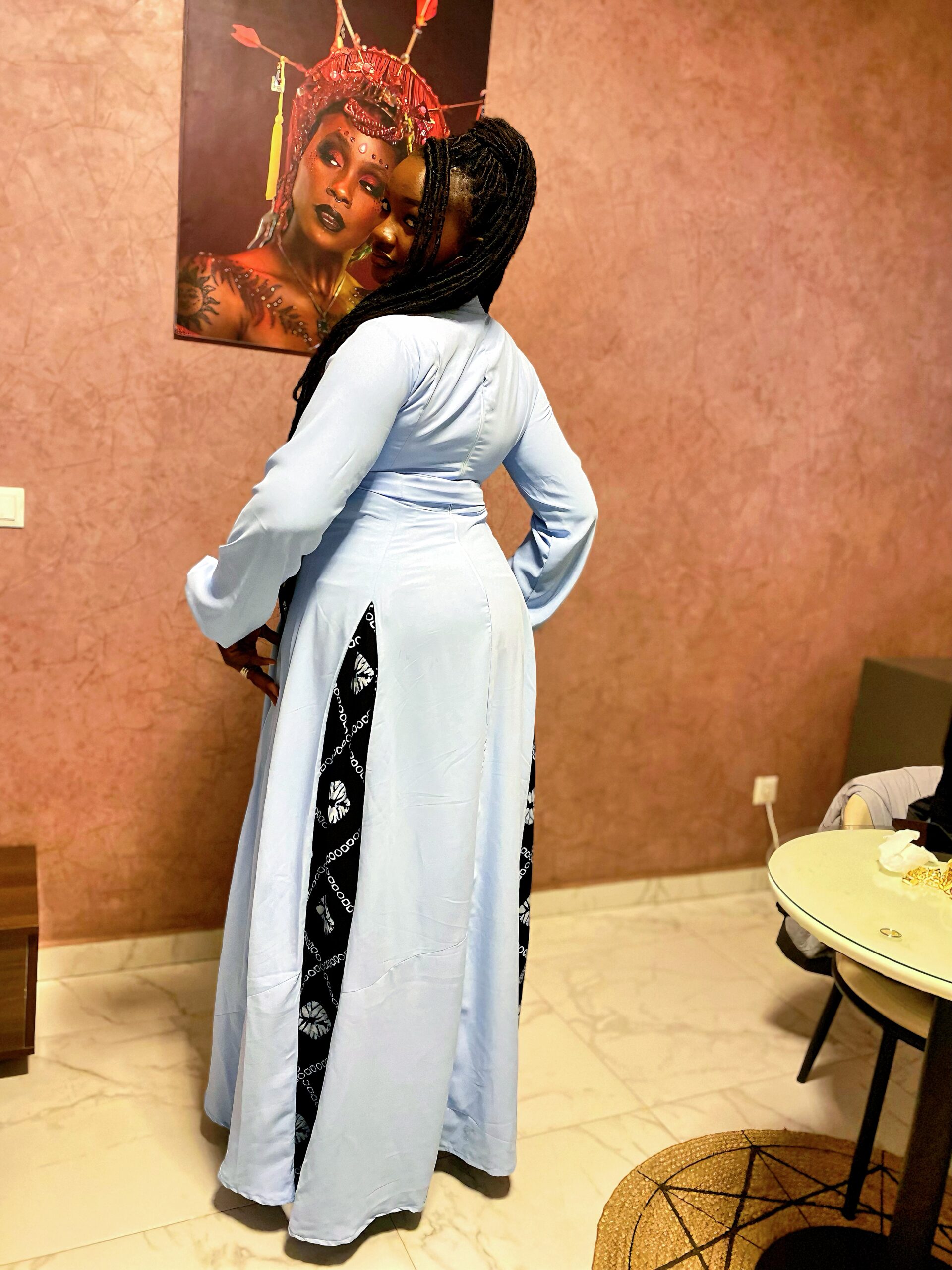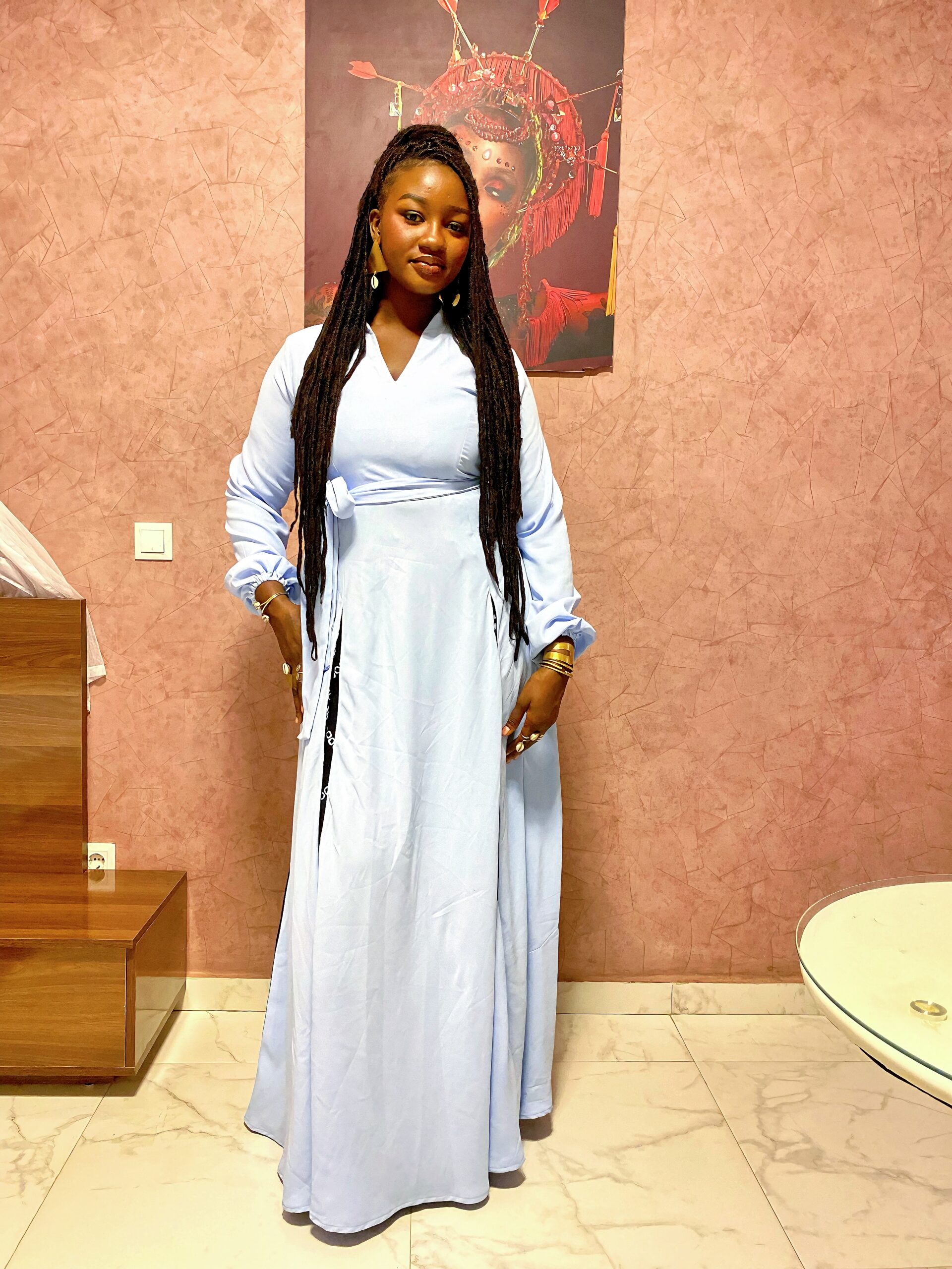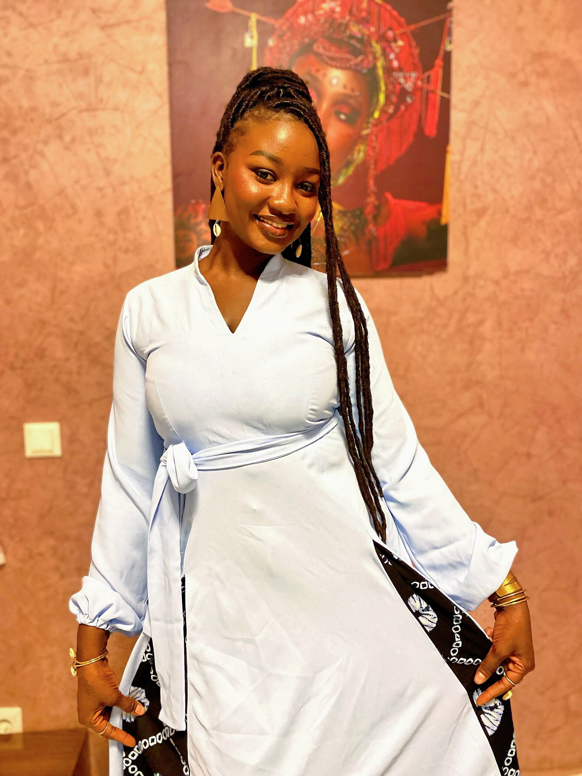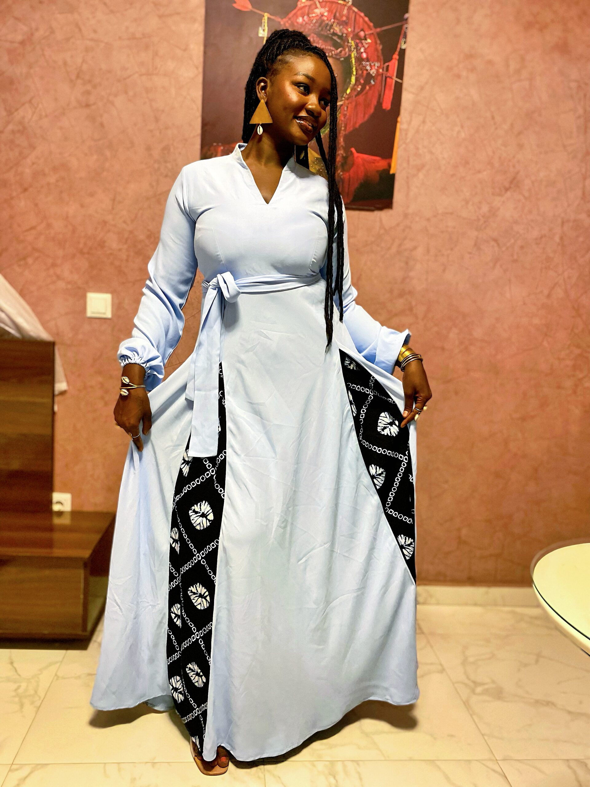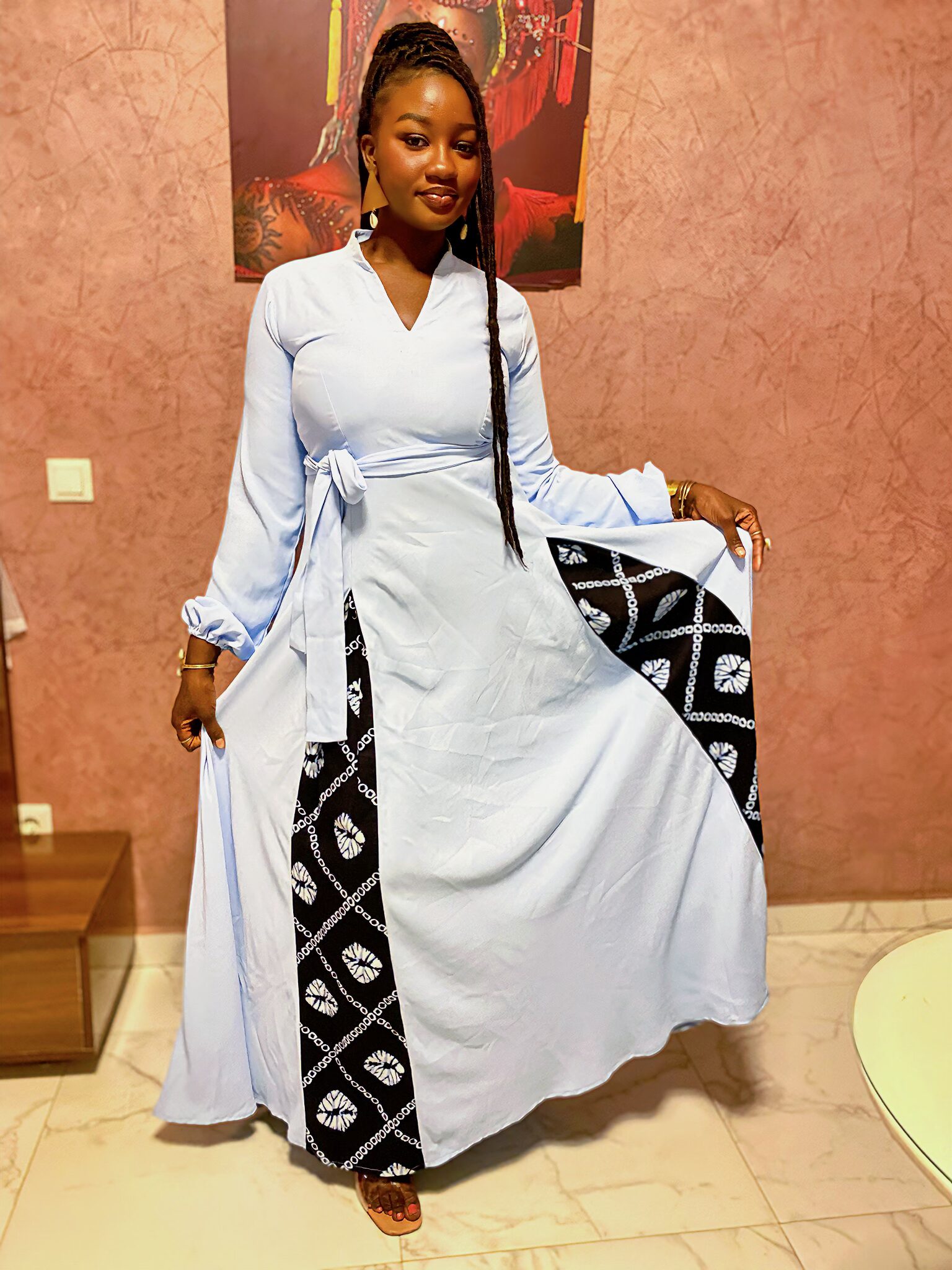 Robe évasée légère et aérienne. Son drapé en soie cache des touches de wax indigo révélant une féminité douce et puissante.
